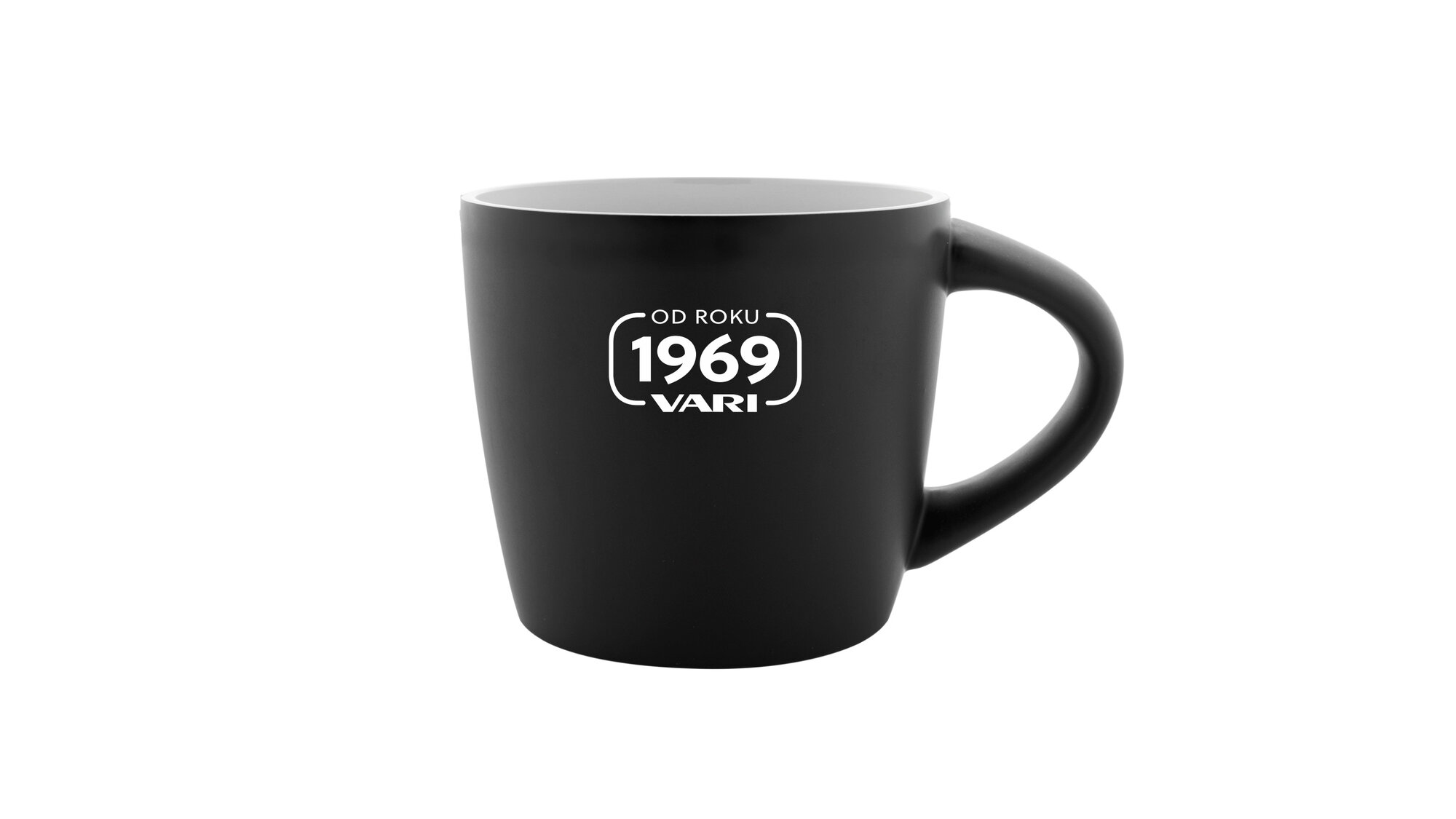 Černý keramický hrnek s potiskem VARI OD ROKU 1969 pojme až 340 ml horkého nápoje. Lze ho mýt v myčce nádobí podle normy EN 12875-1 po dobu nejméně 125 mycích cyklů.